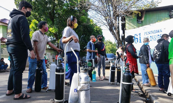 Người dân đứng chờ nạp bình oxy bên ngoài một nhà máy ở Jakarta, Indonesia, hôm 12/7. Ảnh: Reuters.
