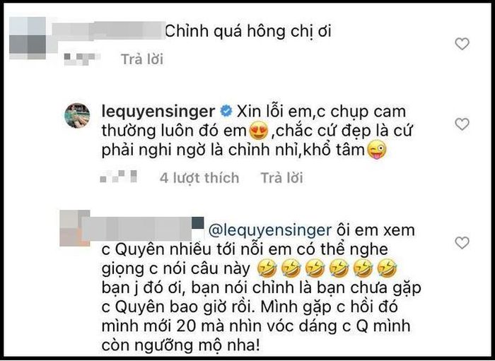 Trước câu hỏi này, Lệ Quyên cũng liền đáp lại một cách mỉa mai: "Xin lỗi em, chị chụp cam thường luôn đó em. Chắc cứ đẹp là cứ phải nghi ngờ là chỉnh nhỉ, khổ tâm".