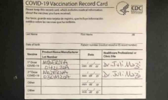 Thẻ tiêm chủng giả mà Mazi cung cấp cho khách hàng. Ảnh: Bộ Tư pháp Mỹ.