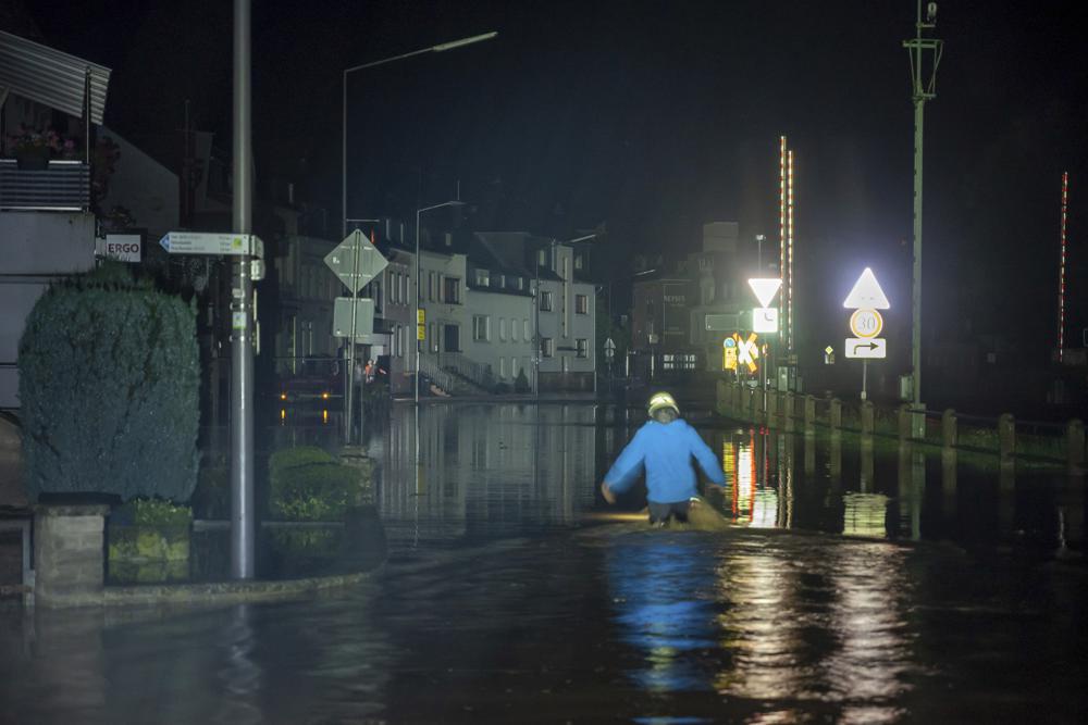 Ngày 14/7, một lính cứu hỏa đã chết đuối trong quá trình cứu hộ ở thị trấn Altena, miền Tây nước Đức. Trong ảnh, một lính cứu hỏa lội qua một con phố ở Kordel, Đức, nơi bị ngập bởi sông Kyll vào sáng ngày 15/7.