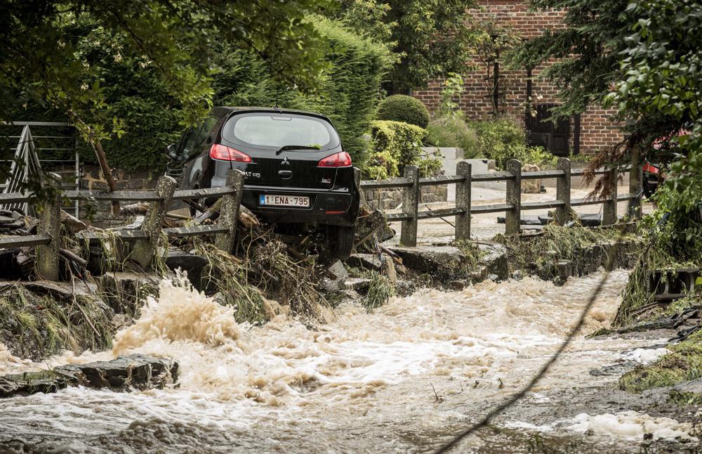 Lượng mưa tương đương 2 tháng cộng lại đã giảm ở một số khu vực trong một hoặc 2 ngày qua, theo cơ quan thời tiết quốc gia Pháp. Cơ quan này dự báo sẽ có nhiều trận mưa dữ dội vào ngày 15/7 và đưa ra cảnh báo lũ lụt cho 10 khu vực. Trong ảnh, một chiếc ôtô mắc kẹt trên một hàng rào đá ở tỉnh Liege, Bỉ.