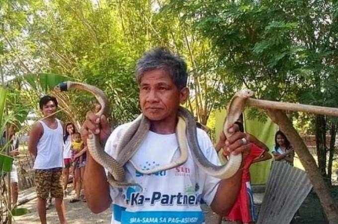 Bernardo Alvarez, 62 tuổi, bắt được con rắn hổ mang phương bắc Philippines ở thị trấn Mangaldan, tỉnh Pangasinan, hôm 9/7. "Người rắn" Bernardo đã được hàng xóm tung hô sau khi bắt được con vật.