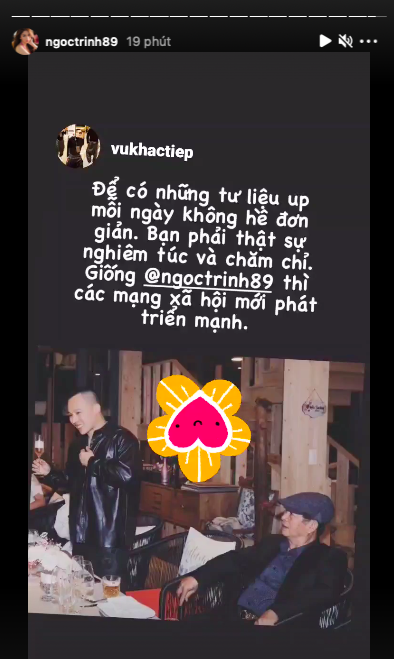 Chưa dừng lại đó, Vũ Khắc Tiệp còn nhắc tới “gà cưng”: “Ngọc Trinh thì quá đặc biệt rồi. Ngọc Trinh không làm gì mà vẫn hot nhỉ” khiến người mẫu quê Trà Vinh vội vàng phản đối: “Ai nói không làm gì?”. Ngồi cùng bàn ăn là MC Thanh Huyền cũng đỡ lời cho đàn chị: “Chị Ngọc Trinh là người rất siêng năng luôn".