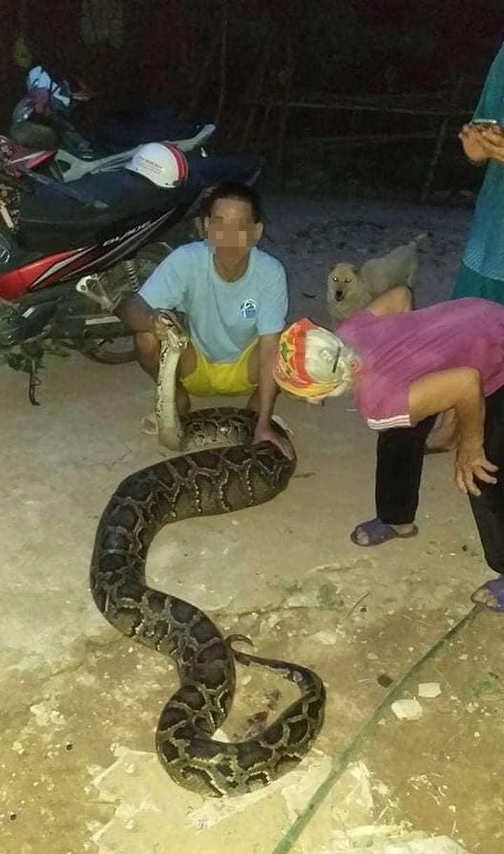 Trước đó nhiều ngày, người dân ở xóm 10 thỉnh thoảng lại phát hiện dê và gà bị mất một cách bí ẩn. Chiều 15.7, một người dân ở xóm 10 đi ra vườn nhà (gần bìa rừng) thì phát hiện con trăn lớn đang nằm trong vườn.