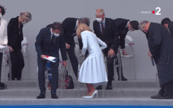 Bên cạnh đó, dù không đeo khẩu trang, Đệ nhất phu nhân Pháp còn vô tư nghiêng người trò chuyện với chồng vi phạm quy định giãn cách an toàn để phòng chống đại dịch Covid-19. Tuy nhiên, đó chưa phải là tất cả. Cộng đồng mạng còn "soi" được hành động kém tinh tế khác của Đệ nhất phu nhân Pháp.