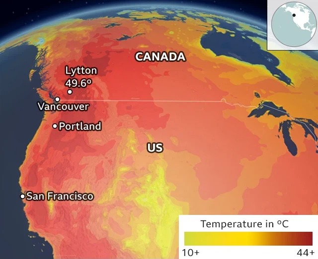 Những khu vực tưởng chừng chỉ có khí hậu quanh năm ôn đới, bây giờ đã nóng hơn cả thủ đô Cairo của Ai Cập: Nhiệt độ ghi nhận được ở tỉnh British Colombia của Canada nhiều ngày đã duy trì quanh mức 49,6oC. Nắng nóng đã đốt cháy một thị trấn – Lytton, khiến hơn 1.000 người dân ở đây phải di tản.