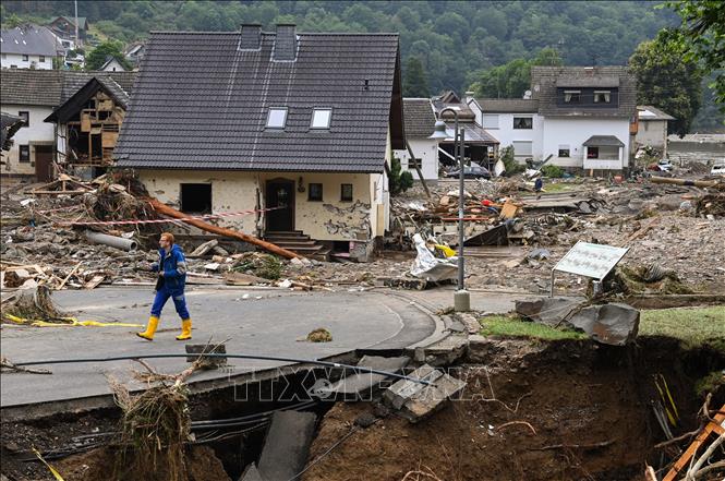 Tuyến đường bị phá hỏng do mưa lũ tại Schuld, gần Bad Neuenahr-Ahrweiler, miền Tây Đức ngày 16/7/2021. Ảnh: AFP/TTXVN