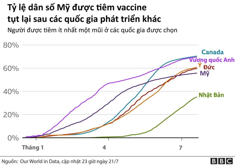 Mỹ vẫn đi trước một số nền kinh tế lớn khác, chẳng hạn như Nhật Bản, nhưng tỷ lệ tiêm chủng ở Mỹ đang chững lại trong khi những nơi khác thì đang tăng lên.
