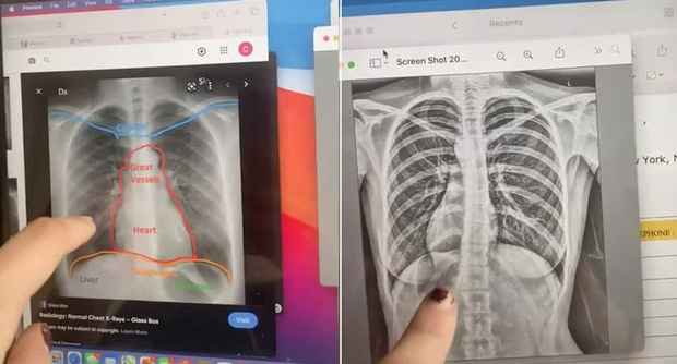 Tại bệnh viện, các bác sĩ thực hiện chụp X-quang phổi cho cô gái tuổi teen để chẩn đoán bệnh. Tuy nhiên kết quả lại nằm ngoài dự đoán của tất cả mọi người. "Tôi được chụp X-quang phổi vì cơn ho không thuyên giảm", Claire Mack nói trong video trước khi cho người xem nhìn thấy hình ảnh chụp X-quang gây sốc của mình.