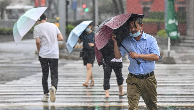 Người dân ở thành phố Ninh Ba chạy tìm chỗ trú ẩn khi bão In-fa ập tới (Ảnh: AFP).