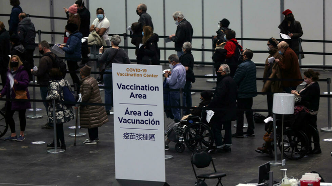 Người dân chờ bên trong Trung tâm Javits, một địa điểm tiêm chủng Covid-19, ở thành phố New York, Mỹ (Ảnh: AFP).