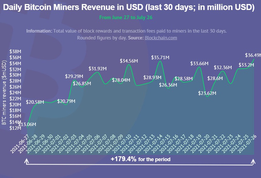 Doanh thu mỗi ngày của việc khai thác Bitcoin đã tăng tới 180% trong tháng 7/2021. Ảnh: chụp màn hình.
