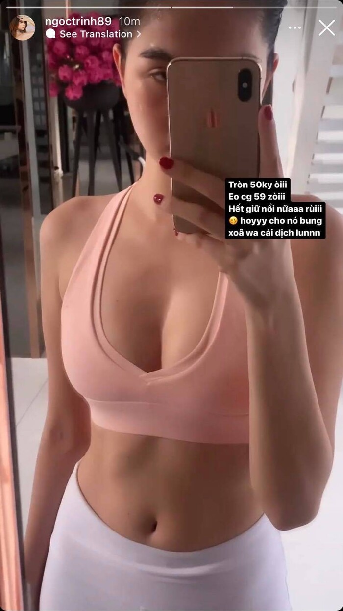 Trên trang cá nhân vừa qua, Ngọc Trinh đã khiến dân tình không khỏi bất ngờ khi đăng tải hình ảnh của bản thân kèm chú thích cho biết cân nặng hiện tại đã cán mốc 50kg và số đo vòng eo thì sắp chạm ngưỡng 60.