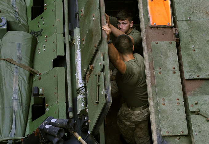 Lính Mỹ mở cửa nóc của một chiếc AAV trong lúc bảo dưỡng. Ảnh: US Navy.