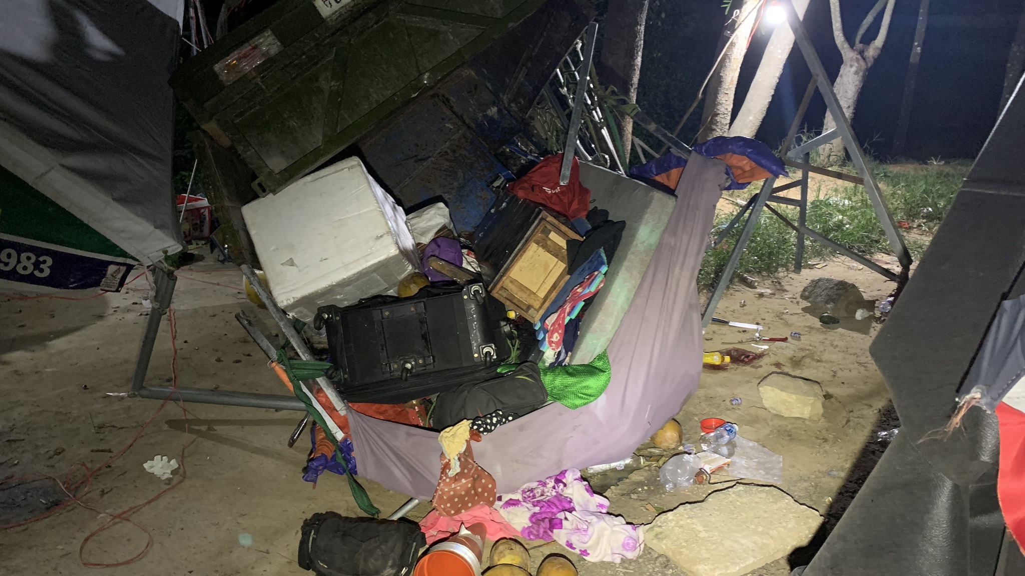 Cú va chạm làm xe ba gác văng vô rạp mái che của chốt kiểm dịch Covid-19 bên lề đường.