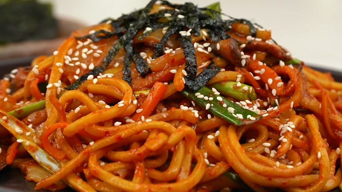 Thường được phục vụ vào bữa trưa và bữa tối, japchae là món mì truyền thống của Hàn Quốc gồm các nguyên liệu: khoai lang, rau, thịt bò, mì, một chút đường và nước tương. Tùy thuộc vào cách chế biến của từng vùng mà món mì này có thể được bổ sung thêm nấm. Japchae có hương vị ngọt ngào, thịt mềm và sợi mì dai tạo nên một cảm giác thú vị khi nhai.