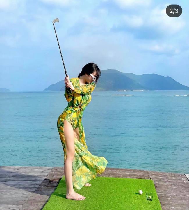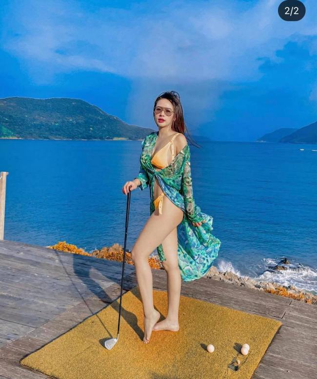 Nàng hot girl Hà thành Phương Bora kết hợp nghỉ dưỡng với chơi golf, vì thế cô chọn trang phục mát mẻ và gợi cảm.