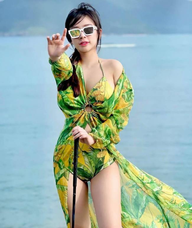 Cô mặc đồ bơi 2 mảnh kèm áo khoác ngoài sắc màu tạo thêm hiệu ứng bắt mắt trong mỗi shoot hình.