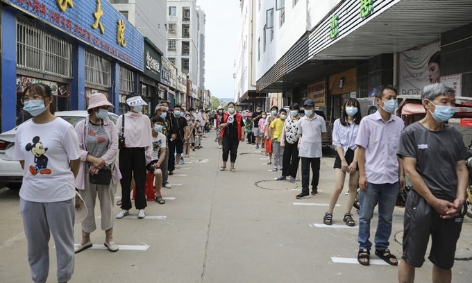 Người dân xếp hàng xét nghiệm Covid-19 tại thành phố Hoài An, tỉnh Giang Tô, Trung Quốc hôm 2/8. Ảnh: AFP.