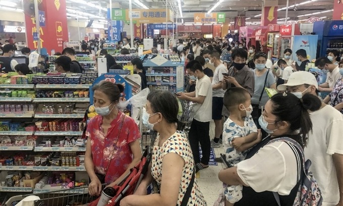 Người dân xếp hàng chờ thanh toán tại một siêu thị ở Vũ Hán, tỉnh Hồ Bắc, Trung Quốc, hôm 2/8. Ảnh: AFP.
