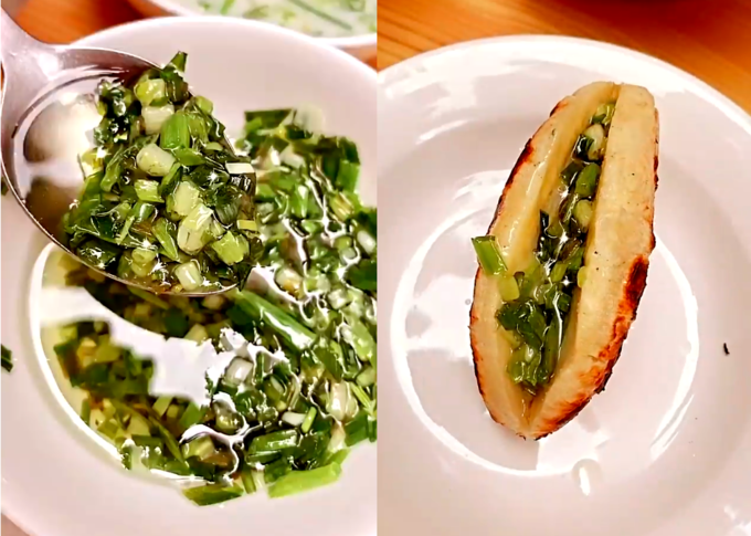 Người đẹp và nhóm bạn còn rất yêu thích món chuối nướng mỡ hành kiểu miền Tây. Chuối được bóc vỏ, nướng sơ qua cho lớp ngoài hơi se se lại rồi mới cho ra cán dẹt. Thuý Kiều sử dụng 2 chiếc thớt gỗ để làm công đoạn này, sau đó tiếp túc nướng đến khi xem xém mặt là được. Mỡ hành được làm từ trước đó. Hành thái nhỏ, rưới trực tiếp mỡ đang sôi lên là được.