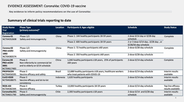 - Trên trang WHO, các dữ liệu vaccine TQ (1,2) cho thấy đa số nghiên cứu giai đoạn III (quan trọng nhất (được thực hiện bên ngoài Trung Quốc. Ví dụ như CoronaVac được thử nghiệm tại Indonesia, Thổ Nhĩ Kỳ, Brazil, Chile, và Trung Quốc. Giai đoạn III của CoronacVac được thử nghiệm chỉ trên 1040 người tại Trung Quốc, trong khi thử nghiệm trên 12,688 người tại Brazil, 13,000 người tại Thổ Nhĩ Kỳ, 1620 người tại Indonesia (xem hình).