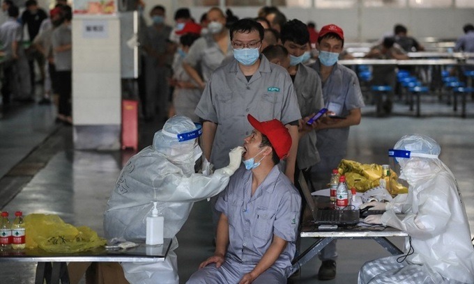 Nhân viên y tế lấy mẫu xét nghiệm Covid-19 cho công nhân nhà máy sản xuất phụ tùng ô tô ở Vũ Hán, tỉnh Hồ Bắc, Trung Quốc hôm 4/8. Ảnh: AFP.