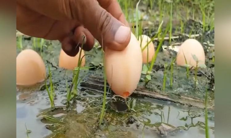 Nhét trứng xuống ruộng, người đàn ông sớm thu hoạch thành quả nhưng xem ra cách này hơi tốn kém. Đây là cách bắt cá mà rất nhiều nông dân sử dụng ngoài đồng. Trông khá vui mắt vì có quá nhiều cá.