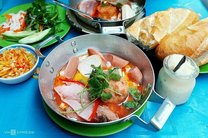 Bánh mì chảo đầy đặn với phần trứng chiên lòng đào, pate, chả lụa, jambon, xúc xích, phô mai và viên xíu mại mềm không bị khô là món ăn sáng nhiều năng lượng cho thực khách. Ổ bánh mì giòn xé nhỏ chấm với nước sốt đậm đà trong chảo bánh mì nóng, ăn kèm đồ chua, ngò rí, dưa leo cắt miếng mỏng cùng các loại gia vị cay mặn theo khẩu vị tùy thích. Quán nằm trên đường Đặng Trần Côn, quận 1. Ảnh: Tâm Linh