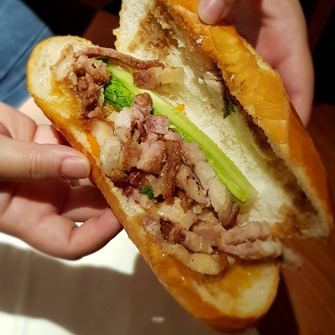 Bánh mì heo quay cũng là lựa chọn cho buổi sáng vừa nhanh, tiện lợi, đầy đủ dinh dưỡng. Thịt quay miếng có vỏ giòn rụm, phần nạc mềm xen lẫn mỡ được tẩm ướp đậm vị lại thơm lừng. Bánh mì giòn bên ngoài, trong là thịt heo béo, đậm đà hòa quyện vị tươi mát của dưa leo, ngò, cay cay của khoanh ớt đỏ, nước sốt mằn mặn làm vực dậy vị giác buổi sáng của bất kỳ thực khách nào. Ảnh: @awiratedja/Instagram