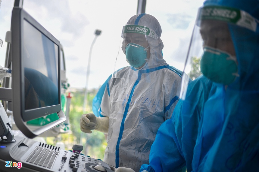 Bác sĩ Trần Thanh Linh và bác sĩ Trần Hữu Chinh siêu âm và theo dõi tình trạng thai nhi của một sản phụ đang điều trị tại Bệnh viện Hồi sức Covid-19 TP.HCM. Ảnh: Duy Hiệu.