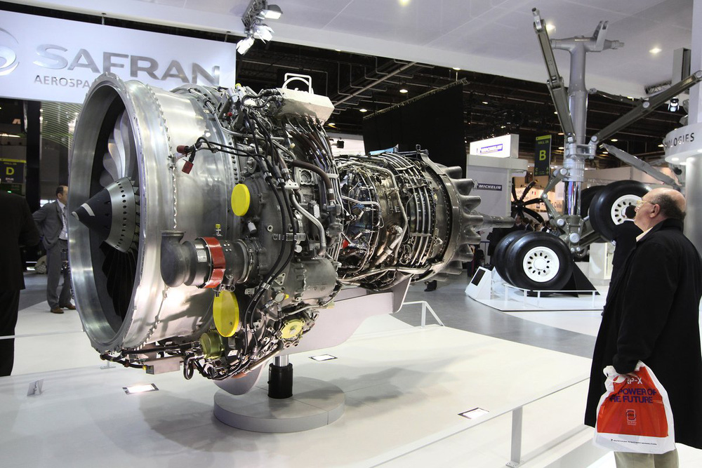 Mô hình động cơ SaM146 do Công ty Snecma của Pháp (Tập đoàn Safran) và Công ty NPO Saturn của Công ty Power Jet của Nga sản xuất, mỗi bên nắm giữ 50% cổ phần, được trưng bày tại Triển lãm Hàng không Quốc tế Paris vào ngày 22/6/ 2011. Động cơ được chọn là động cơ của Sukhoi Superjet 100 (Ảnh: AFP)