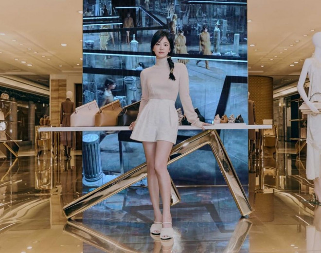 Chỉ sau đó ít giờ, Song Hye Kyo tiếp tục khiến netizen Hàn dậy sóng lần 2 với loạt ảnh tới thăm cửa hàng của Fendi tại Hàn Quốc. Là đại sứ thương hiệu toàn cầu của Fendi, Song Hye Kyo diện trang phục nằm trong bộ sưu tập Thu Đông 2021 của nhãn hàng, trang điểm tự nhiên, tóc tết lệch dịu dàng.