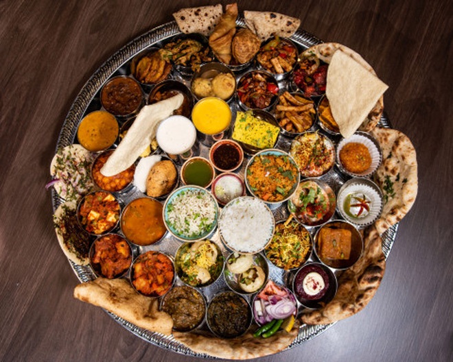 Mâm đồ ăn có 50 món bao gồm cà ri, cơm, bánh mì, các món truyền thống, món tráng miệng và đồ uống lassi. Tổng trọng lượng của mâm đồ ăn này lên tới 7,6 kg.