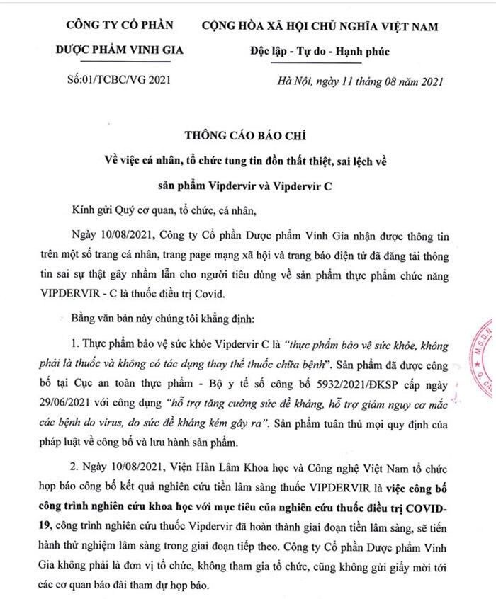 Điều đáng nói, trong thông tin gửi báo chí, công ty này cho thấy "không liên quan" đến Vipdervir - thuốc điều trị COVID-19 được Viện Hàn lâm công bố. "Công ty Cổ phần Dược phẩm Vinh Gia không phải là đơn vị tổ chức, không tham gia tổ chức và cũng không gửi giấy mời các đơn vị tới tham gia tại buổi họp báo này", thông cáo có đoạn.