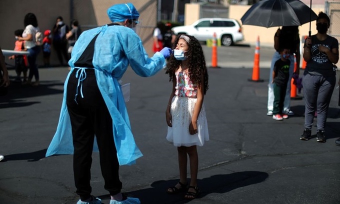 Nhân viên y tế lấy mẫu xét nghiệm Covid-19 cho một em nhỏ tại thành phố Los Angeles, bang California, ngày 12/8. Ảnh: Reuters.