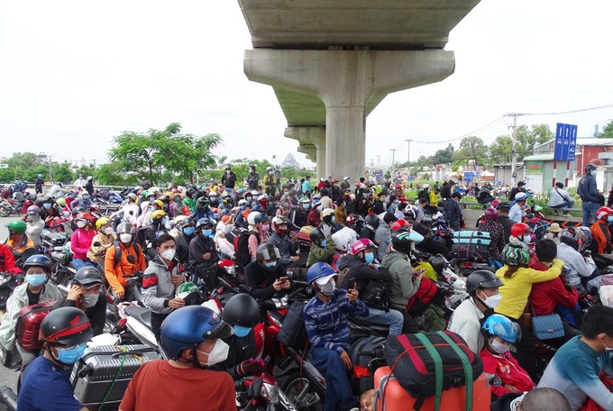 Cách Bến xe Miền Đông mới gần 30 km, sáng nay hơn 500 người dân sau khi hẹn nhau trên mạng xã hội đã tập trung ở quốc lộ 1, quận Bình Tân, chạy về các tỉnh miền Trung. Nhiều người chở lỉnh kỉnh đồ đạc, dự định đi thành đoàn về quê khi biết tin TP HCM sẽ giãn cách thêm một tháng. Hàng trăm xe máy đậu chắn ngang làn đường gây ùn tắc quốc lộ.