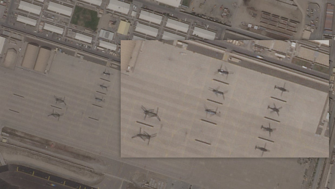 Trực thăng Mỹ ở sân bay Kabul trên ảnh vệ tinh chụp hôm 17/8. Ảnh: Planet Labs.