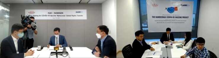 Đại diện HLB ký biên bản ghi nhớ với Nanogen về vắc xin Nanocovax. Ảnh: HLB