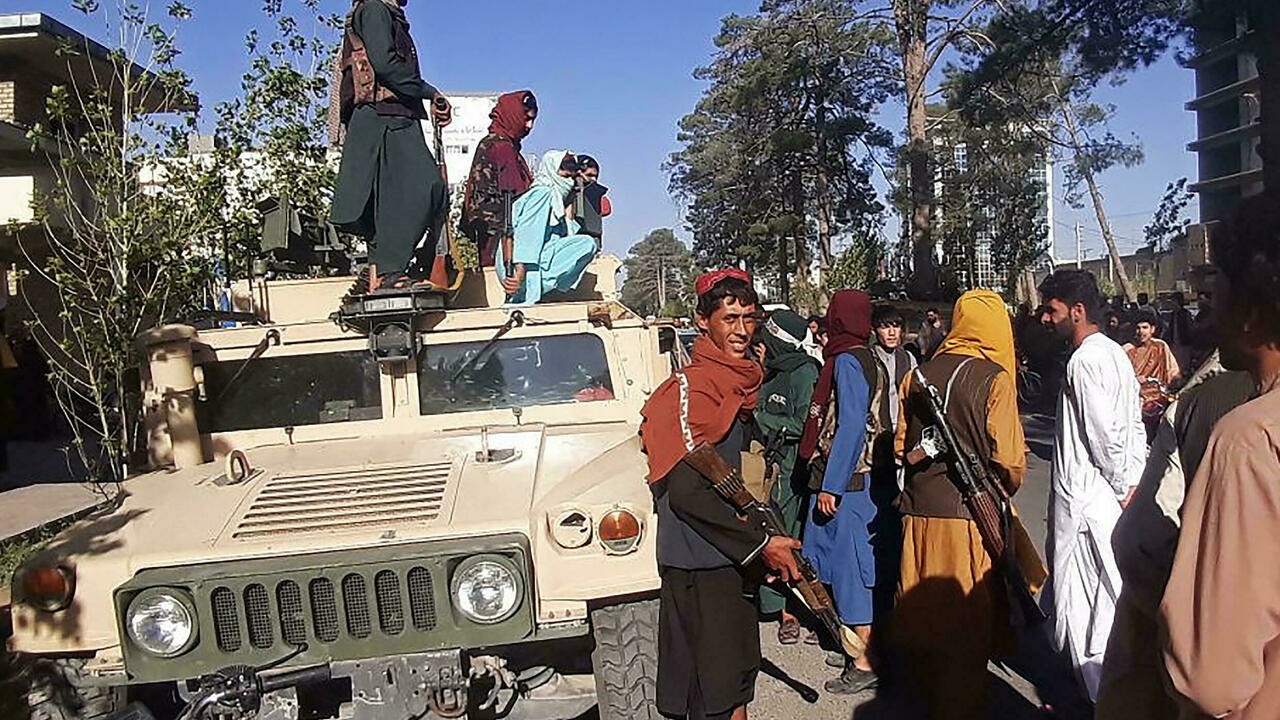 Ảnh minh họa: Chiến binh Taliban chiếm được một chiếc xe thiết giáp Humvee do Mỹ chế tạo mà lực lượng chính phủ Afghnistan bỏ lại tại Herat (Afganistan) ngày 13/08/2021. - AFP