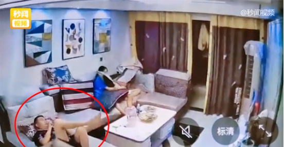 Trực giác của người vợ mách bảo chồng đang 'nói xạo', thế là cô kiểm tra camera an ninh. Hình ảnh camera cho thấy chồng đang nằm lướt điện thoại vô cùng thoải mái trên ghế sofa. Trong khi cô con gái thì ôm gối ngủ ngon lành bên cạnh. Có vẻ hai bố con đang vô cùng relax.