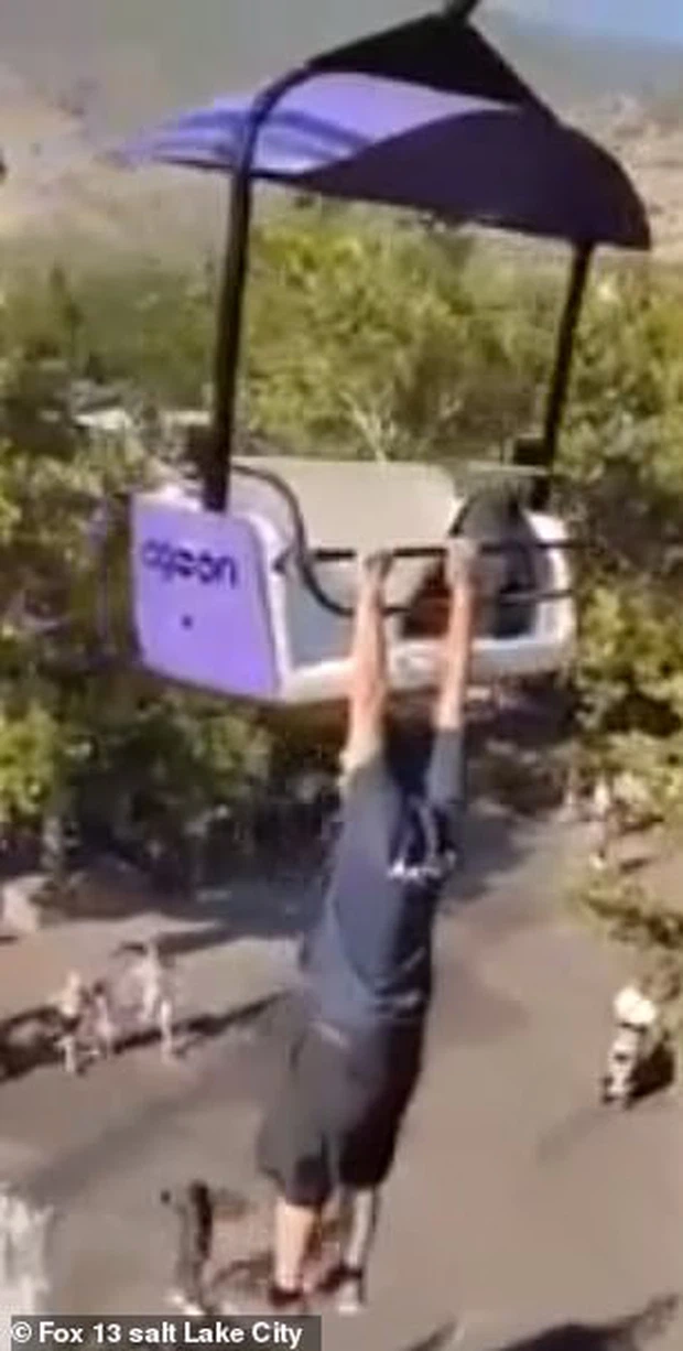 Nhiều người ngoái nhìn sửng sốt khi chứng kiến anh chàng này treo lủng lẳng trong không trung, tay bám chặt chiếc ghế cáp treo