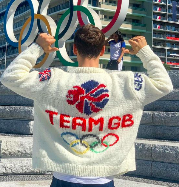 Bức ảnh được Tom Daley chia sẻ trên Instagram hôm 20/9, nhận hơn 590.000 lượt thích. Anh mặc áo cardigan trắng, phần lưng có hình cờ, logo nước Anh và biểu tượng năm vòng tròn của Olympic. Ở mặt trước, anh đan chữ "Tokyo" bằng tiếng Nhật. Chiếc áo được Tom Daley đan trong thời gian tham dự Olympic.