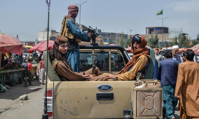 Các thành viên Taliban trên một xe bán tải tại Kabul, Afghanistan, hôm 17/8. Ảnh: AFP.