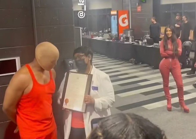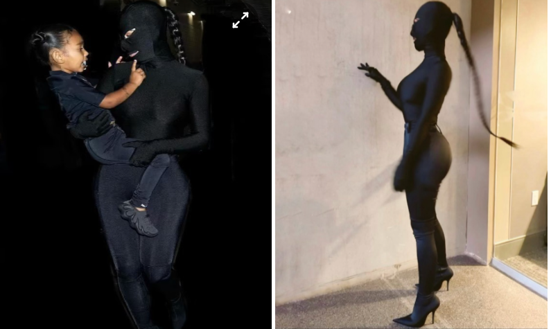 Trước đó, trong buổi ra mắt thứ ba cho album Donda của Kanye West, Kim Kardashian gây ấn tượng với bộ bodysuit bó sát, giày gót nhọn và mặt nạ che kín mặt. Từ ngày ly hôn, cô vẫn ủng hộ chồng cũ, giữ mối quan hệ bạn bè và liên tục nói tốt về Kanye West. Khi đưa Chicago đến đêm nhạc của cha, cô cho con gái mặc trang phục cùng chủ đề. Ảnh: @kimkardashian.