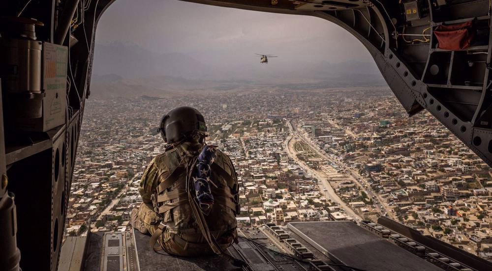 Một lính Mỹ ngồi trên trực thăng CH-47 Chinook bay trên bầu trời Kabul, thủ đô Afghanistan, hồi tháng 5/2021. Ảnh: NY Times