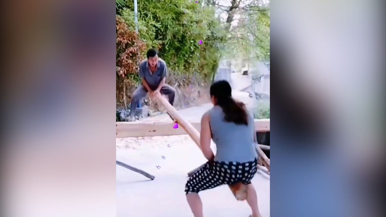 Chồng ngã chổng vó khi chơi bập bênh với vợ. Cô vợ ranh ma dùng tay lay mạnh thanh bập bênh khiến ông chồng mất thăng bằng.