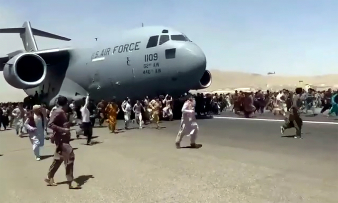 Hàng trăm người Afghanistan chạy theo vận tải cơ C-17 của Mỹ tại sân bay Kabul ngày 16/8. Ảnh: AP.