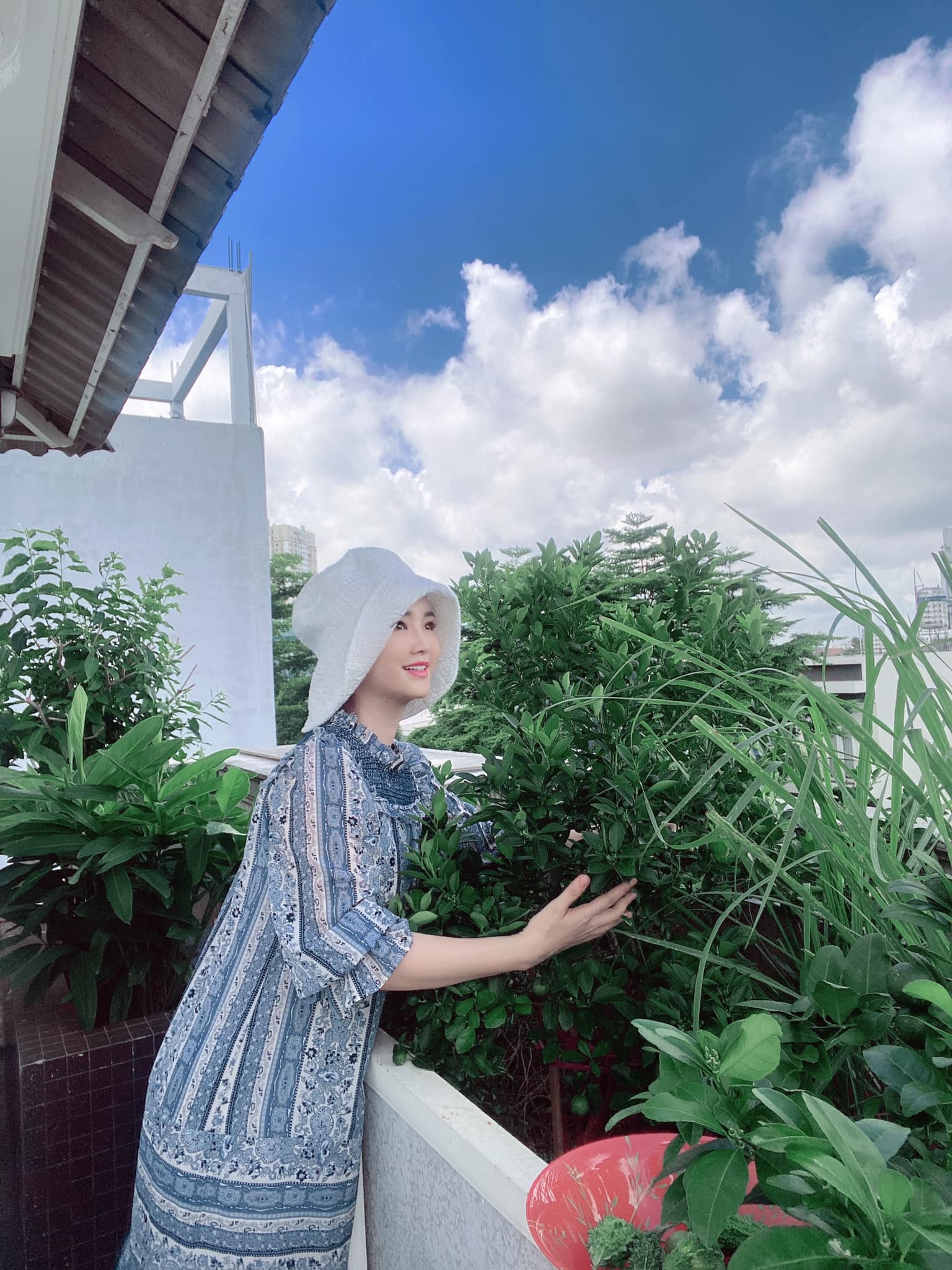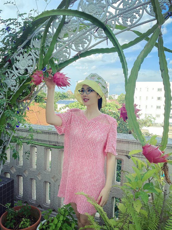 Ngoài thanh long, vườn cây nhà Hoa hậu Giáng My có đủ loại như: hoa hồng, mướp, cây đậu biếc, ớt... Tất cả đều cho hoa trái khiến sân thượng nhà người đẹp lúc nào cũng rực rỡ sắc màu như khu vườn cổ tích.