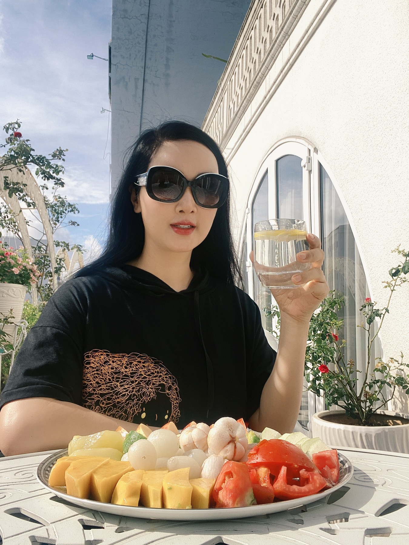 Người đẹp thưởng thức trái cây tươi ngon tại vườn nhà. (Ảnh: FBNV)